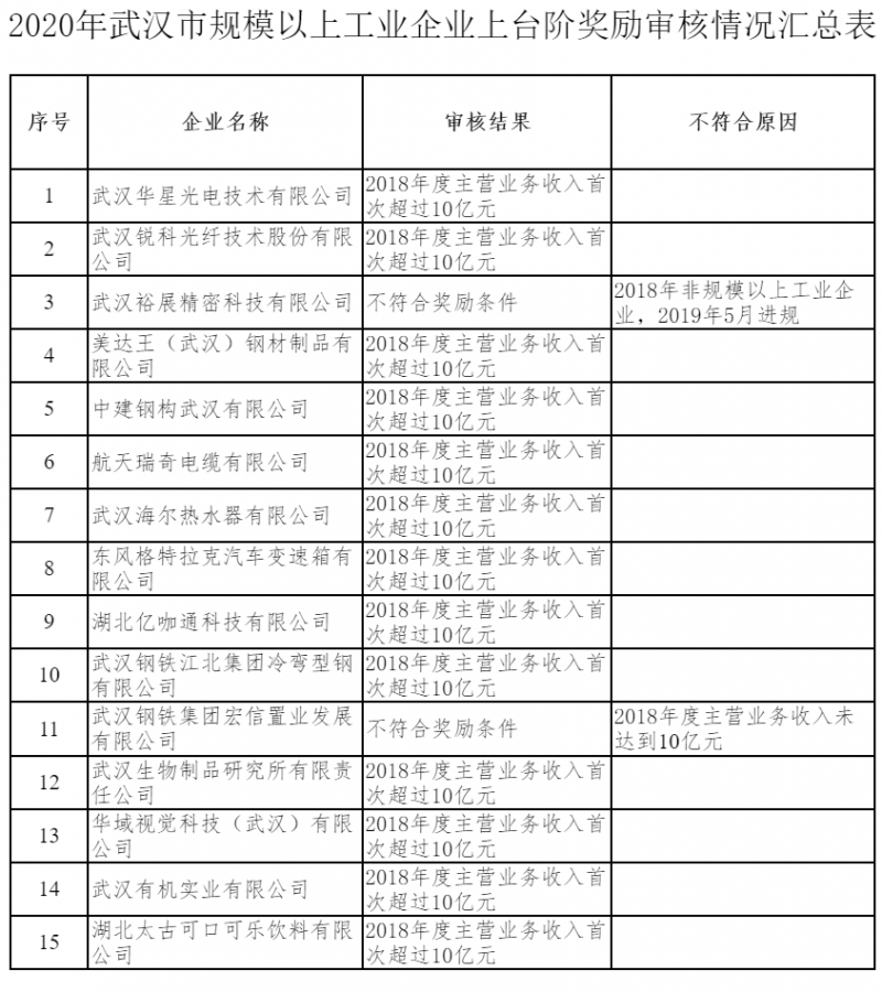 市經(jīng)信局關(guān)于2020年武漢市規(guī)模以上工業(yè)企業(yè)上臺階獎勵項目審核情況的公示