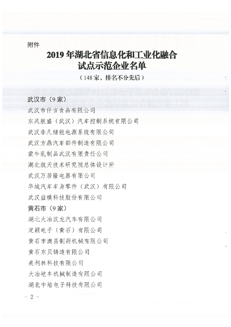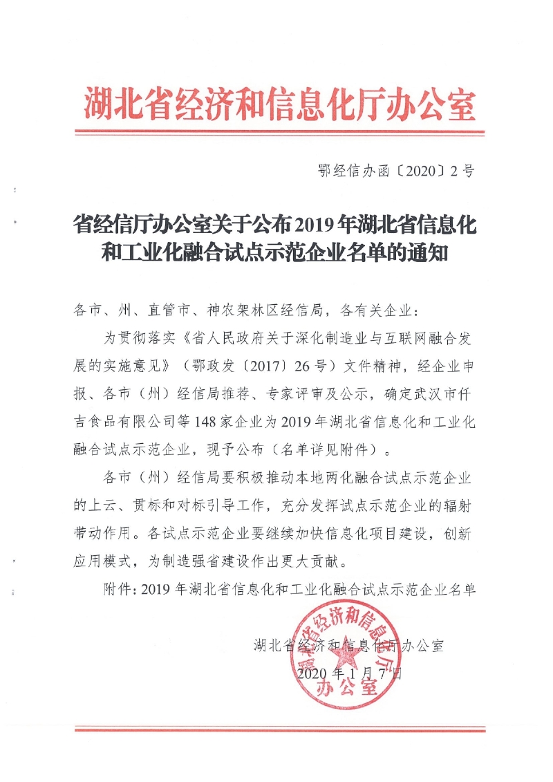 省經(jīng)信廳辦公室關(guān)于公布2019年湖北省信息化和工業(yè)化融合試點(diǎn)示范企業(yè)名單的通知