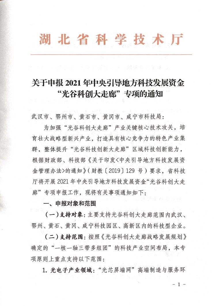關于申報2021年中央引導地方科技發(fā)展資金“光谷科技創(chuàng)大走廊”專項的通知