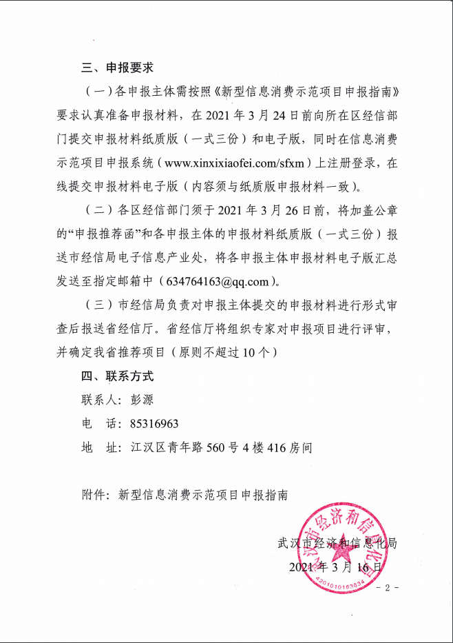 各申報企業(yè)需按照《新型信息消費示范項目申報指南》要求認真準備申報材料,在2021年3月23日17:00之前提交申報材料紙質版(一式三份)至東湖高新區(qū)政務中心7號樓7016室和word電子版及PDF蓋章版一并打包發(fā)送至郵箱1930171438@qq.com,同時在信息消費示范項目申報系統(tǒng)(www.xinxixiaofei.com/sfxm)上注冊登錄,在線提交申報材料電子版(內容須與紙質版申報材料一致)。